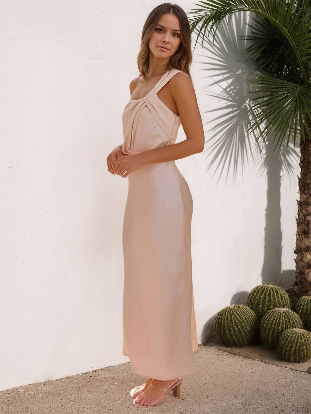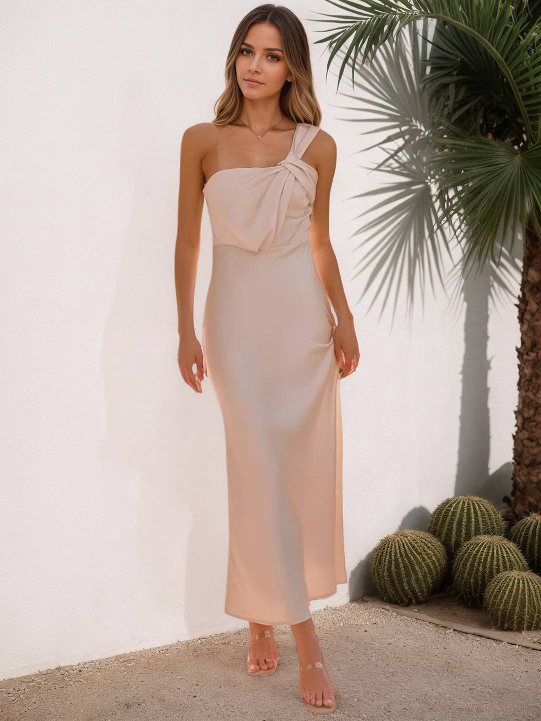 This dress features a one-shoulder design, showcasing unique charm. The satin fabric provides a silky touch, while the fitted cut accentuates a graceful silhouette. An A-line skirt adds depth, and zipper details ensure comfort. Whether for wedding guests, parties, or daily wear, it exudes elegance and style. Sleeveless design is perfect for summer, effortlessly adapting to various occasions.